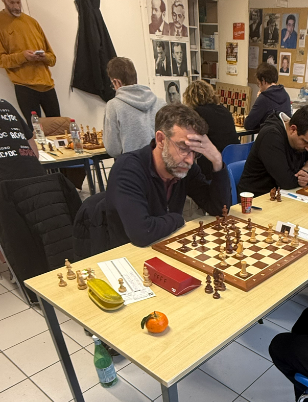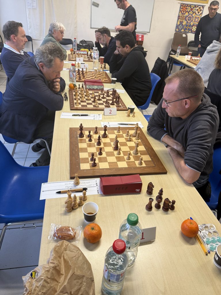 Au 3ème échiquier, j’affronte un sympathique adversaire qui me surclasse de 135 points elo (1 955 F) que j’avais identifié comme très dangereux… J’ai l’impression de foirer mon entame de partie mais je retombe sur mes pattes. Le jeu est plutôt positionnel et même si sa tour s’infiltre par la colonne A, je remets de l’ordre et contrôle les points d’entrée, l’empêchant de doubler. Je joue contre son fou de case noire et bloque les avancée de pions. Je cours après sa tour coincée et ma propre tour fait le péage en a5. Je pense réaliser une performance et tenir une nulle forcée mais il trouve un moyen de rentrer en finale ! Je suis un peu contrarié mais ça tient toujours ! Il commence à se faire tard, nous approchons des 5h de jeu. Nous rentrons dans une finale tour + 4 pions chacun. L’analyse montrera par la suite que, la position est toujours nulle et que mon adversaire et moi, avons joué 54 coups avec plus de 97 % de précision… Malheureusement, je vois qu’il va récupérer un pion et je choisis de lâcher le mauvais… La différence de niveau va se jouer dans la finale et l’expertise de mon adversaire va lui permettre de transformer l’essai malgré un dernier guet-apens tenté… Bravo à lui.
