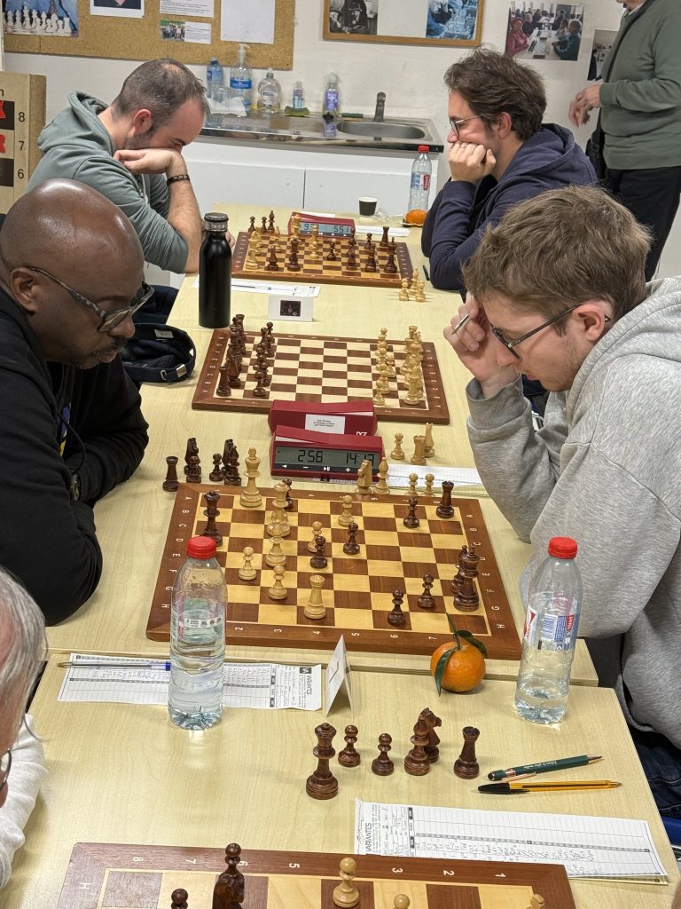Au 8ème échiquier, Jean rencontre un joueur au classement à peu près équivalent. Après un début de partie difficile caractérisé par la perte d’un pion, Jean parvient à retrouver le contrôle et parvient à annuler !
